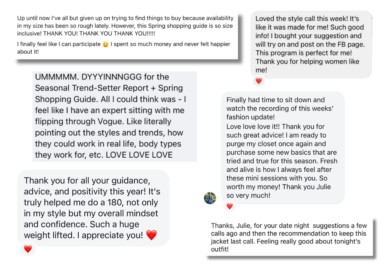 Ready for a personalized experience? When you upgrade to the 12-Month VIP Style Coaching Experience, it’s like having a stylist by your side for an entire year. You’ll get exclusive access to bi-weekly group coaching calls with Julie, curated shopping guides, seasonal style classes, and ongoing personalized advice—all designed to enhance your experience as you put the content you learn in the program into action, transforming your wardrobe and building your confidence every step of the way.